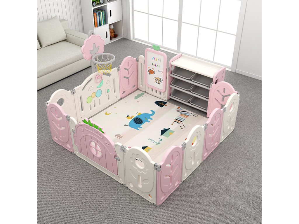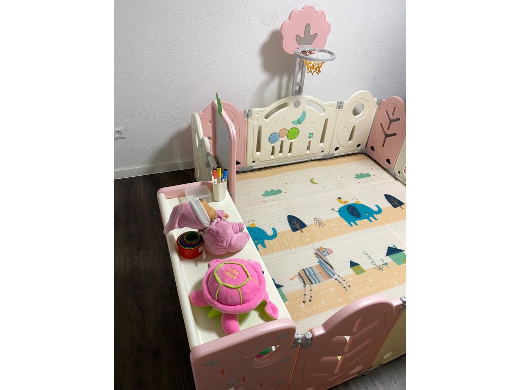 Detská ohrádka 4x4 ružovo biela s komodou, basketbalovým košom, podložkou v dvoch farebných variantách a magnetickou tabuľou. K produktu patria aj fixy a magnetické čislice.